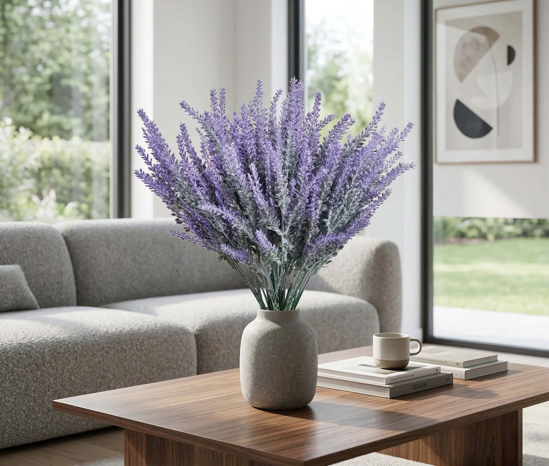 Inserita in un vaso essenziale, la lavanda dialoga con le superfici calde del tavolino e con i toni neutri del soggiorno, creando un punto focale leggero, ordinato e visivamente rilassante.