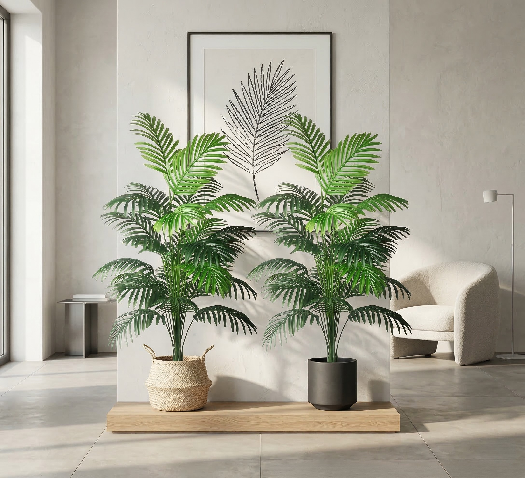 In questo ambiente essenziale e luminoso, la composizione è stata costruita attraverso due palme artificiali inserite su una base in legno per creare un effetto ordinato, architettonico e visivamente equilibrato.