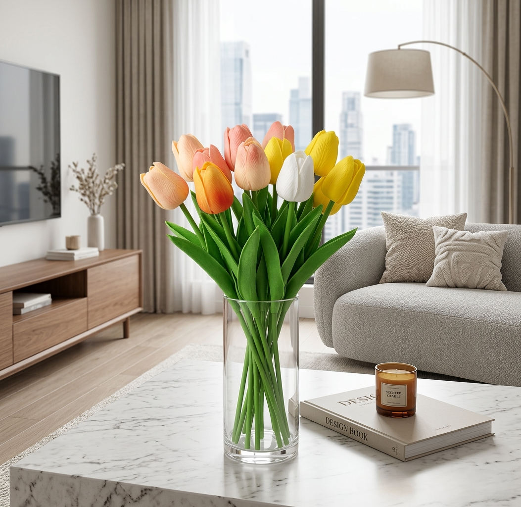 In questo living contemporaneo, la scelta è ricaduta su una composizione di tulipani in lattice pensata per portare luce, colore e morbidezza visiva al centro dello spazio.